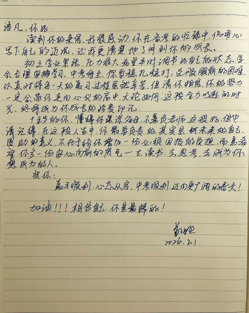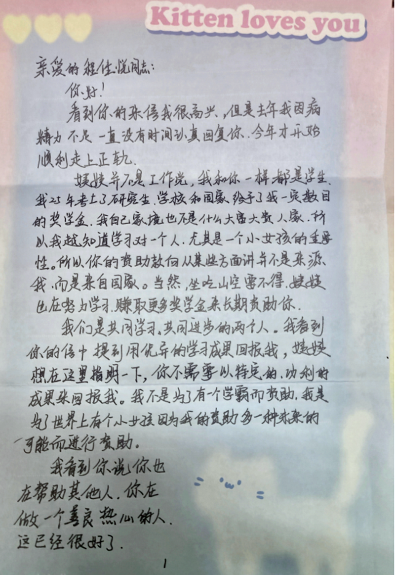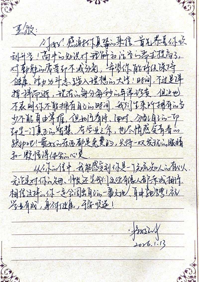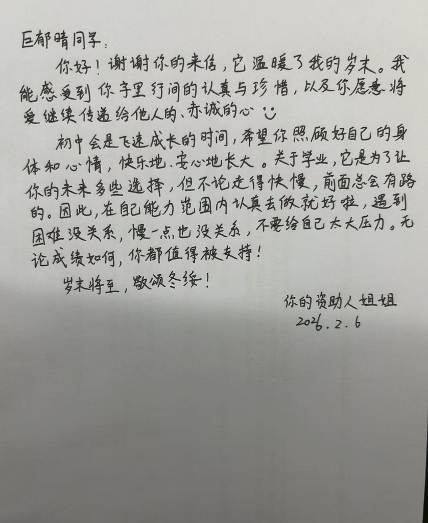 朱亦轩同学: 你好!我是刘妍阿姨。因为之前了解到你们会在学期末写信,所以去年年底没有来得及看,以为你们要到一月才放寒假。今天点进助学小程序里看了一下,才发现你已经在十一月底写信来了。 你在信中谈到初入高中的学习困难,还有选科方面的迷茫,这方面也许我可以给你一点小建议。我自己在高中时是文科生(当时还按照文理来分科,不能自由选科),当时我更擅长历史和政治,不太擅长地理。我觉得历史和政治都需要大量的背诵,同时也需要适当了解时事。同时,政治历史的题目也不止是背诵,而是要理解题目,题目到底在问什么?等你再年长一些,比如高三的题目肯定不会只考课本上背下来的知识,也需要你理解历史发展的脉络,产生更深的了解。至于地理,说实话,我当时也不太擅长。现在看来,我知道的东西太少了,仅仅学课本上的,没法“应付”世界上复杂的现象。比如说我曾经做过一道题,问我为什么道路两边的植被不一样,我怎么也想不到是因为两侧行政区划不同。直到我前段时间问我的一位在社区工作的朋友,她才告诉我,这样的情况是很常见的。这些东西无法从课本上学到,也许只能靠生活的经验。当然,在我还什么也不了解的高中时期,我一般都是把有可能的原因统统写上去,然后得到一个中等分数。 同时,语文、数学、英语这主要的三门课也是很重要的。高中语文比初中语文更复杂,有一些语病题、科技类的阅读,都需要我们了解语法知识。这方面只能靠学校在课堂上教育,至于那些叙事类的阅读,可能平时得多读些材料、书籍,读多了才能提高阅读速度和理解能力,明白阅读想表达什么意思。数学的话,要善于总结不同的题型,有时候我们会觉得“课本上学的简单,怎么练习题这么难了”?我高中时也有这样的想法。那时候我把做错的题都放到一起,来回看,就意识到这些题是可以归为几类的,我就向老师请教,学会一个题型,再做两道练习,这样慢慢补上来了。至于英语,我觉得高中比初中难的地方主要在于从句的大量增加。我不了解现在你对英语的学习程度,你应该先把不同的时态和第三人称单数之类的基础知识搞清楚,然后多背单词,提高词汇量。对于从句,当你读到的时候,你要尽量分析这句子,是什么从句?哪一部分修饰哪一部分?不明白的地方就向老师请教。如果你的听力不好,你就读课文,要注意读得对,不要用错误的读音读。如果你能够读准,那么你就能听懂,你的听力就会提高了。总之语文和英语都是语言类的学科,都需要多读多背。我在中学时曾经尝试过背英语课文,然后在作文中效仿课文里的句子,这对减少语法错误是有帮助的。 我的理科不大好,生物和物理勉勉强强,化学实在学得不成样子。这方面就无法为你提供帮助了。 最后,感谢你的祝福!快过年了,不知你那里冷不冷。祝你新年快乐,新的一年身体健康、学习进步。说实话,阿姨最近的生活也面临许多困难和迷茫,但你的来信鼓舞了我。也许,当我们感觉到自己“存在困难”的时候,就意味着我们要成长和提高了。让我们一起克服困难,一起前进吧!好孩子,阿姨为你加油! 刘妍 2026年1月28日
